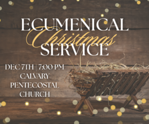 Join us for a beautiful Ecumenical Christmas Service on Sunday, December 7th at 7:00 PM at Calvary Pentecostal Church.